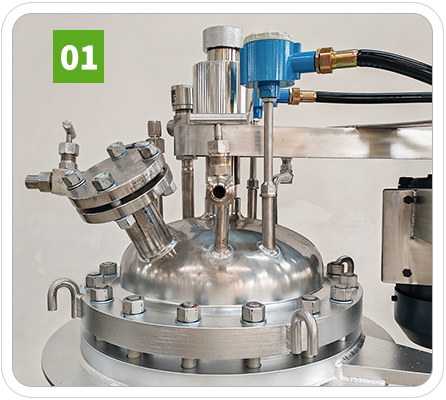 | Kettle lid open port | Needle Valve on Gas Port and Liquid Port, Bottom Insert Tube for sampling or inlet use, Pipe Plug on Solid Charging Port, Platinum Resistance (PT100)on measuring and controlling Temperature Port, Pressure Gauge and Safety Device (Blasting Disc) on Security Blasting Port, and Cooling Coil Faucet for cooling water inlet/outlet. |